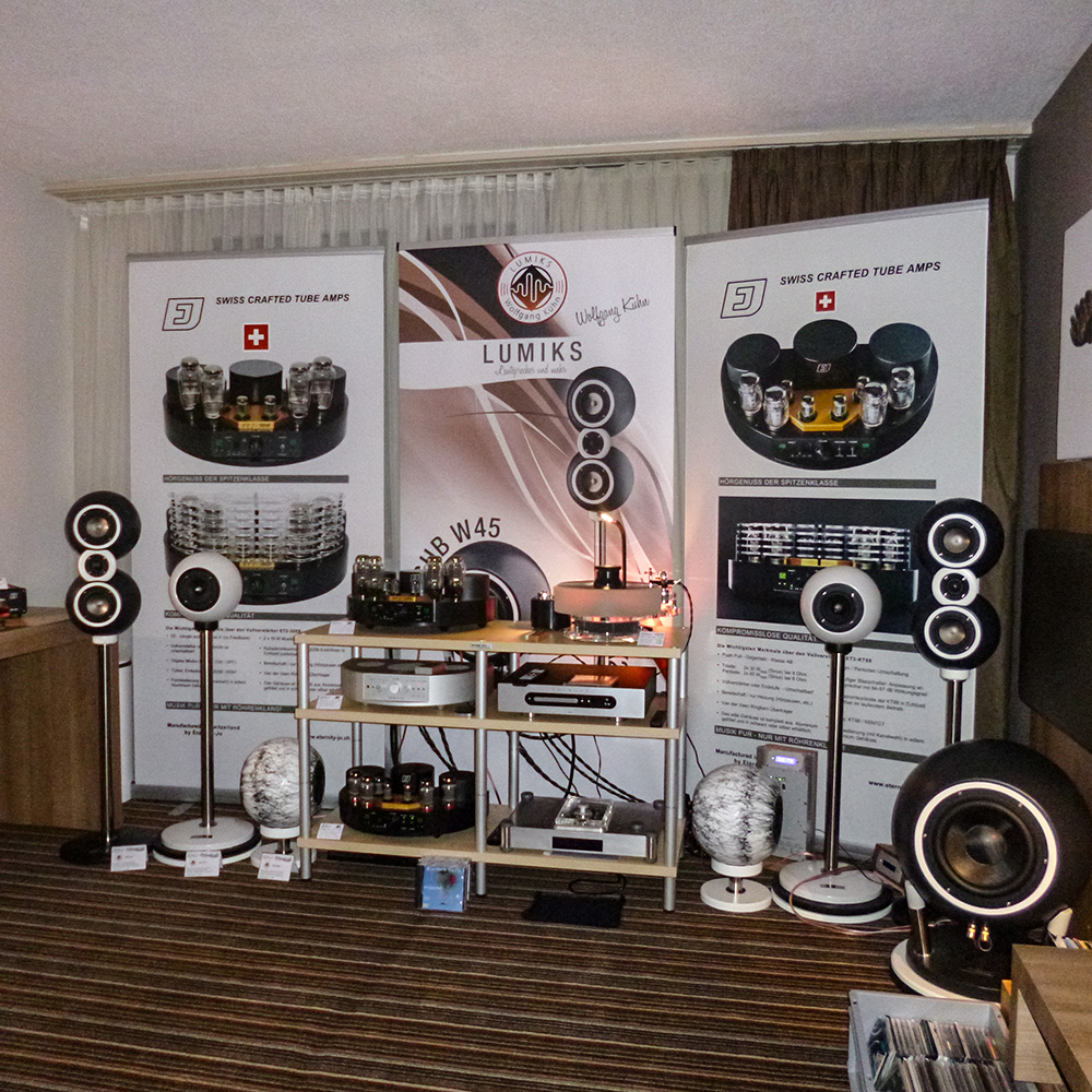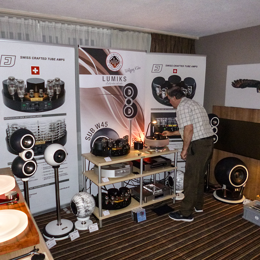 HIGH END Swiss 2017 - Wir konnten die Erkentnisse aus 2016 umsetzen und den Klang deutlich verbessern. Die Absorber und Reflektoren sowie die Stereo Subwoofer machten aus dem kleinen Hotelzimmer ein tolles Hörerlebnis.