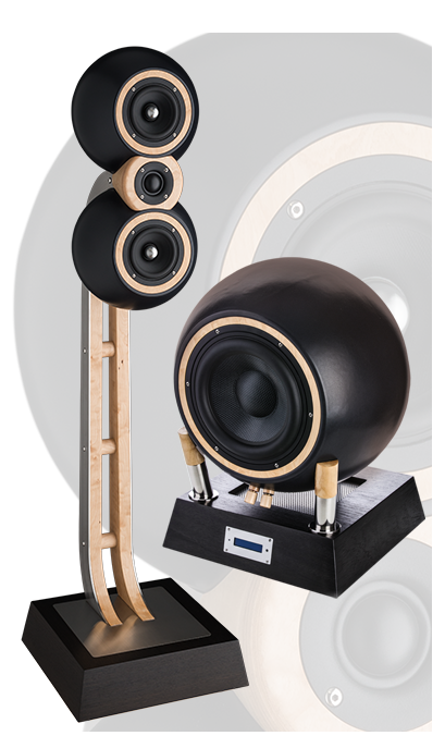 Subwoofer: frei positionierbare 45 cm Keramik-Kugel auf massivem Stand Fuß, mit integriertem Verstärker und DSP. SUB W 45 PS ist nach dem Bassreflexprinzip aufgebaut.